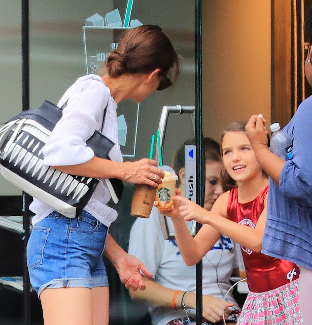 Katie Holmes in Jean Shorts with daughter Suri Outside a Starbucks in New York City